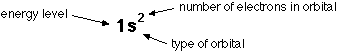 A 1s orbital holding 2 electrons would be drawn as shown on the right, but it can be written even more quickly as 1s2. This is read as "one s two" - not as "one s squared".